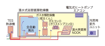 下図で左側にあるのが玄関ポーチにある湯沸かし器です 風呂、床暖房、温水など担当してます 乾太君はないですけど電気ヒーターの24時間換気兼送風機が浴室にあります(図は我が家の実際のものと違います) 電気式よりガス式が色々メリットはあるようです。