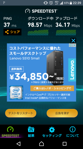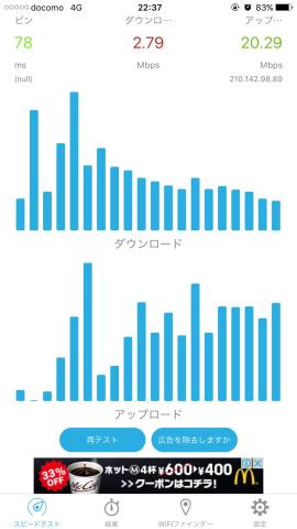 23時頃のデータですが、ダウンロードは2.79Mbpsということで、非常に遅いです。