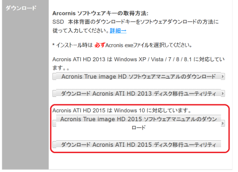 リンクに有る「Download」ボタンをクリックします、下の方にWindows10用の「Acronis True image HD 2015」のマニュアルとソフトがダウンロード出来るボタンが出て来ます。