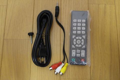 リモコン、AVケーブル、電源コード、高さ調整用の足が付属しています。