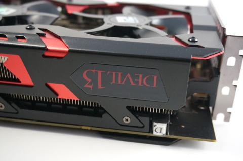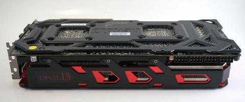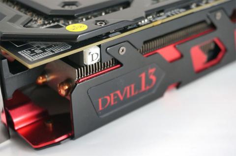 側面には光るDevil13のロゴがある。通電中はゆっくりと明滅する。最近のグラボのように色変更等はできないがDevil13なら赤だけでいいっちゃいい。