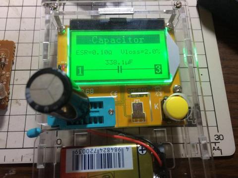 取り外したコンデンサは容量ヌケがないかチェックします。