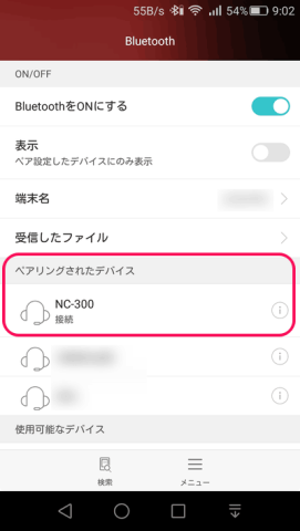 スマホ側でBluetoothの検索を行うと、程なくして「NC-300」が見つかります。