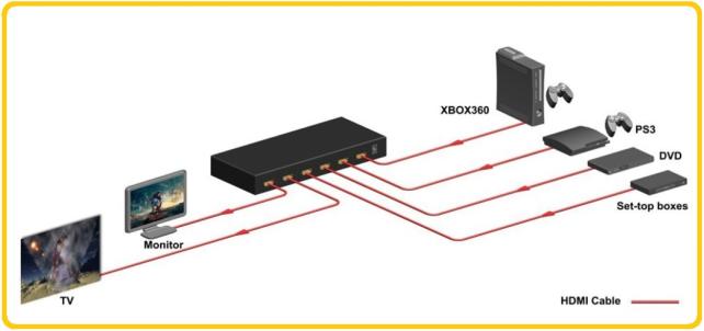 HDMI接続の出力を持つテレビやPCなど4つの入力に対して、HDMI入力を持つ2台のモニターを繋ぐ事が出来ます。