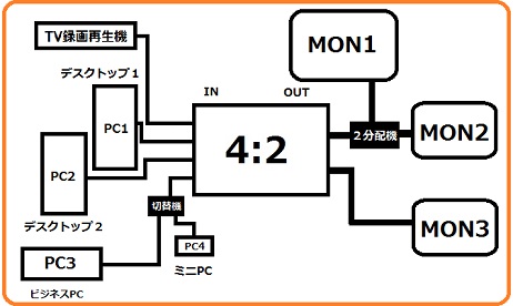 入力機器4台とモニターが2台あれば、接続が変わってもケーブルの抜き差しが必要無いのでとても便利です。