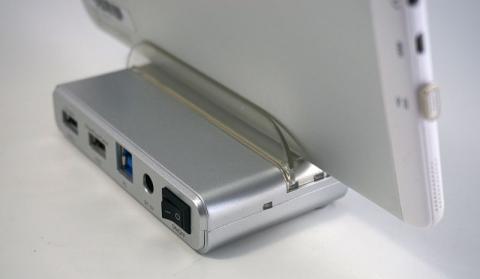 そしてそのために本体はある程度重め(実測180g)にできておりSDカードの取り外しくらいなら本体の重みとケーブルテンションで抑えられるので片手で使える。カードと差し込みやUSB機器の差し込み時はさすがに本体を抑えないとキツいがその時はタブレットスタンド部がハンドルになって指で押さえれば片手でさせる。コレ地味に大きい。