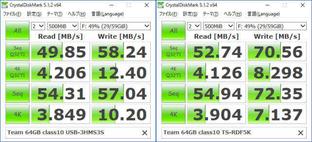 カードリーダーの速度は同じUSB3.0接続のTrancend TS-RDF5K(右)と比べるとWriteが遅くなるがReadは同等。ハブ経由であることを考えれば十分。TS-RDF5Kは稀にカードの認識に失敗するが今のところこちらにはそれがない。