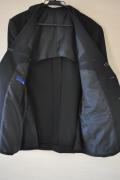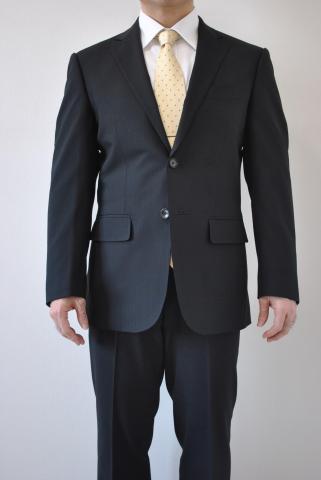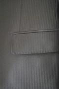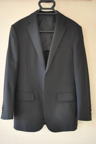 まずは、スーツの上着です。光の関係でグレーっぽく見えますが、実物は下のスラックスのように、もう少し黒に近い感じです。柄も遠目では無地のように見えますが、近寄ると淡いストライプが入っているのが分かります。