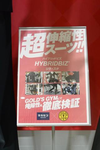 そして、その機能を実証するため、店内に表示してあった下記のポスターにあるように、ゴールドジムというフィットネスクラブとタイアップし、スーツを着たままトレーニングを行い、快適に動けることと、運動後に型崩れせずシルエットをキープできたことをアピールしています。