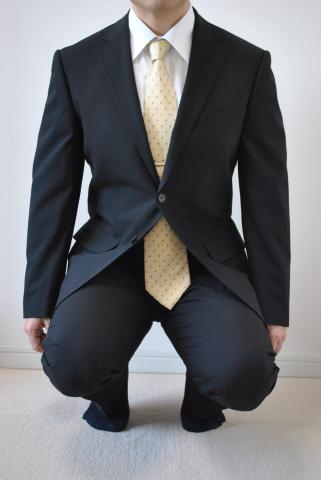 さて、実際に着用してみたのが、下の写真です。今回のサイズはA4(胸囲90、胴囲78、身長165)ですが、ほぼほぼピッタリです。胸回りにはもう少し余裕が欲しいところですが、伸縮機能により窮屈さは感じません。しゃがむとスラックスが張ったように見えますが、はいている方としては、圧迫感はほとんどなく実に快適です。