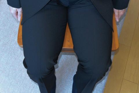 また、電車に座ったとき、特に大腿部が張った感じになるので、いつもは、いったん腰を浮かせて布地を動かすことで調整していましたが、HYBRIDBIZ(R) スーツ ではその必要はありません。下の写真は、椅子に座ったところを自宅で撮ったもので、見た目には張ったように見えますが、生地が広がって圧迫感はほとんどなく、最初に座った状態のままでも違和感は感じません。