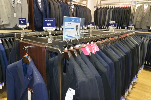 サカゼンではA4といった小さ目のサイズはあまり置いていないのかと勝手に想像してましたが、スラックスの裾直しの間、店内を見て回っていると、上記の専用コーナーのほかにサイズごとの展示があり、A4の展示の中に HYBRIDBIZ(R) スーツ(首のところにピンクの紙が巻いてあるもの)もあるのを発見しました。できれば、ここにあるネイビーのストライプなどもチョイスしてみたかったところですが、上記の色柄も嫌いではないので、まあ良しとします。