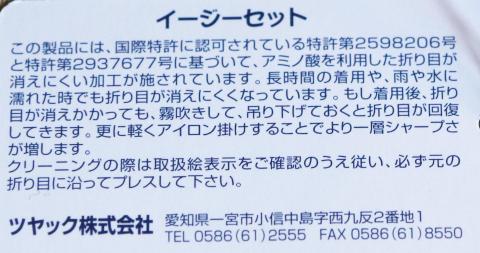 このHYBRIDBIZスーツは2パンツタイプとなっています。詳細については後述しますが、上の写真のタグに書かれているように復元力の高さがありますので、1日おきに交互に履くようにすると、アイロン掛けなどの手間が最小限になるという売りもあるようです。ただ、今回は敢えて世間並みの負荷に近づけるために、片方のスラックスのみを着用するようにしました。