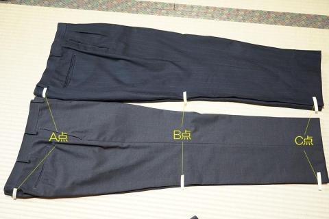 まず、スラックスについては両端と膝付近に目印のテープを貼っておき、ベルト側のテープをA点、膝付近をB点、足首付近のテープをC点とします。そしてA点とB点を持って破れない程度に引っ張りA-B間の伸び幅を、B点とC点も同様に引っ張りB-C間の伸び幅を計測します。