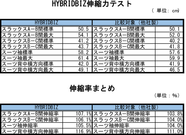 但し、この生地の伸縮性は特定方向にのみ優れているため、HYBRIDBIZスーツの開発に当たってはどの方向の伸縮性が快適性に寄与するかという点を徹底的に分析し、それに合わせて生地の方向を組み合わせているとのことです。