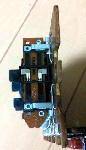 スライドボリュームの基板ですが、2本のピンに発泡スチロールが刺さっていて、天面カバーとのショートを防ぎつつ支えていた様で、基板が曲がっていました。