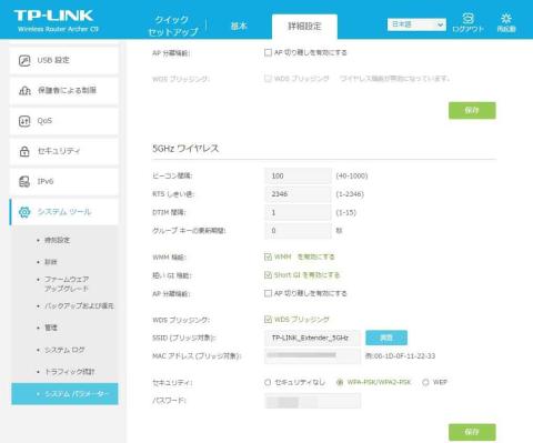 C9の設定に入り、システムツールーシステムパラメーター-5GhzワイヤレスにあるWDSブリッジングを設定します。