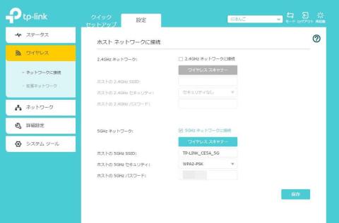 「調査」ボタンを押して、周辺にある無線LAN機器のの中から、RE305のSSIDを選択。パスコードを入力して保存。