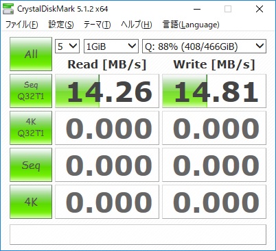 こちらは計画実行前、つまりC3150とC9だけを使い、C9側のUSB3.0ポートにHDDを接続し、C3150側のパソコンからそのHDDに接続した際のベンチマーク結果です。
