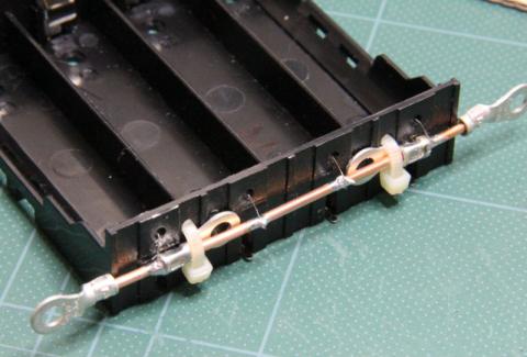 ヒューズ線は、電池ボックスに元々ついている電極のセルの着脱に影響ない位置と 追加したバス線をハンダ付けしてつなぎます。