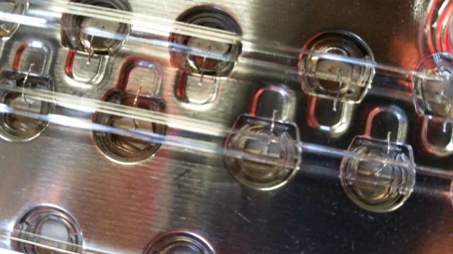 18650セルのプラス極がアレイの電極になる金属と細い線でつながっています。