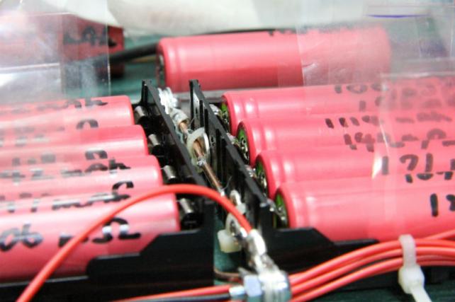 ちなみに、Li-ionバッテリーアレイを作る場合の一般的な方法は、バッテリーの極をつなぐのにニッケル(まれにステンレス)の薄板をスポット溶接して接合します。ハンダでなく溶接なのは、バッテリーが熱に極端に弱いため、接合ポイントだけに熱を集中できるという点で溶接が有利です。