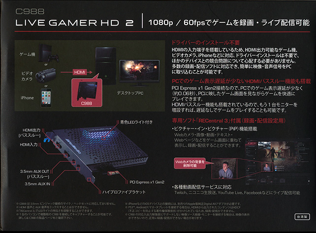 今回のレビューは、AVerMedia Live Gamer HD2(C988)という最近発売された1080p 60fps録画対応のキャプチャボードです。(入力信号も録画も1080p 60fps対応)