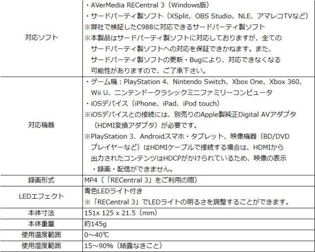 AVerMedia Live Gamer HD2(C988)は、AVerMedia RECentral 3というアプリケーションで操作を行いますが、公式サイトに、他のアプリケーションでも動作が確認できたアプリケーションが掲載されています。(前述のスペック表参照)
