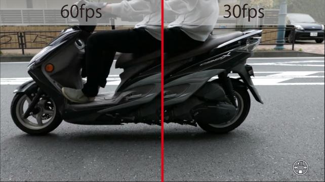 その結果、60fpsと30fpsの違いが一番良く判るのが、走行中のスクータでした。