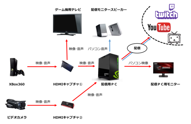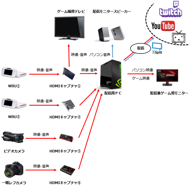 基本的な構成はCase.2と同じとなるが、配信ソフトは「Xsplit Broadcaster」を使う。複数の配信サイトで同時配信を行うには「RECentral 3」ではなく、サードパーティ製ソフトを使う事になるので、配信設定が少し煩雑になる。