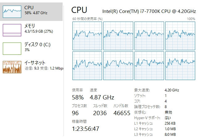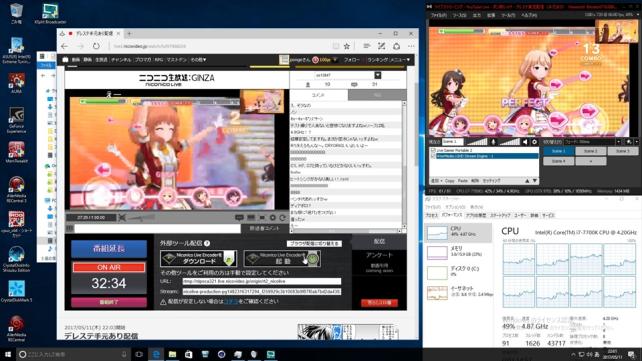 ちなみに、同時配信の際は配信用パソコンの性能と、インターネット回線の速度に気を付けよう。私の環境(CPU: i7-7700k 4.9GHz OC、フレッツ光回線)で「Youtube Live」と「Twitch」へ同時配信している最中はこのような感じになった。CPUの使用率からすると、3つのサイトへの同時配信は厳しいかもしれない。