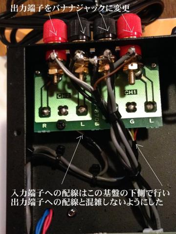 (1)出力端子:バナナジャックに変更。幸いシャーシーを加工する事無く取り付け可能であった。これまでバナナプラグ・ジャックの組み合わせが一番導通がいいのではと感じてましたが、様々なスピーカーコード端子の接触抵抗がネットで公表され、バナナプラグ・ジャックの組み合わせが最も抵抗が小さかったという結果に納得できました。以来、スピーカーコード端末は全てバナナプラグとしてます。