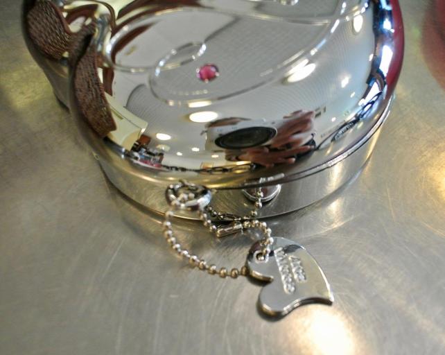 シルバーメッキの樹脂製ケースはハート型で スワロフスキーのようなキラキラが散りばめられています