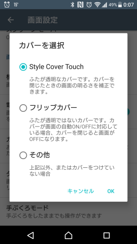 Style Cover Touchはこちらのカバー用の設定でカバーをした状態でも画面が消灯せず操作できます。