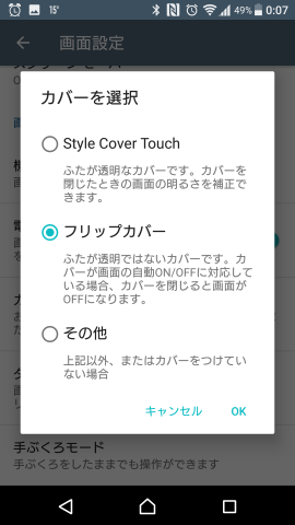 XperiaXZは純正カバーが2種類あり、設定-画面設定-カバー選択 でカバーを閉じたときの動作を