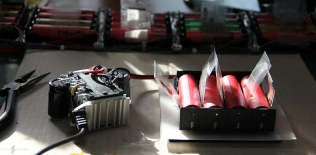 実験中のLi-ionアレイ に溜めた電気はできるだけ効率よく利用したいと思っていて、変換の段数を最小にして電圧変換のロスを少なくするのにも役立ちます。
