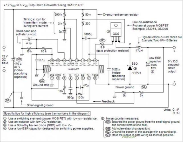 このモジュールは、HITACHI の HA16114FP を使用していて、回路もほぼ標準回路のとおりのようです。Feedback の分圧抵抗を マイナス側4.7kΩ、プラス側5.6kΩ+12kΩの直列にして出力を11.86V ≒ 12Vとしています(改造前)。