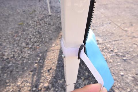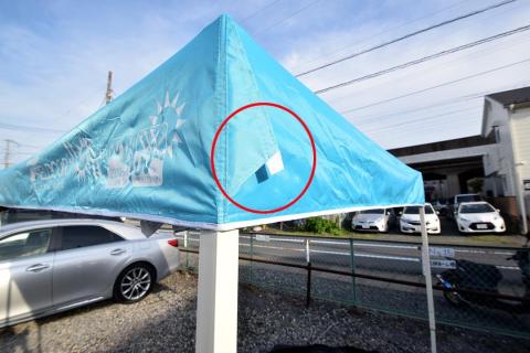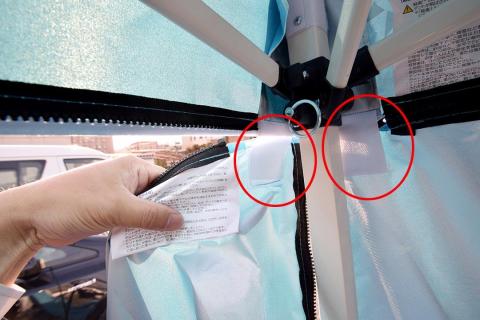 横幕は、以前の物はジッパーで固定するだけだったので、強風で取れてしまったり、取り付け時に合わせるのが大変だったが、新型はマジックテープが屋根から垂れ下がっているので、一度マジックテープで固定してからジッパーで固定し、