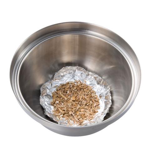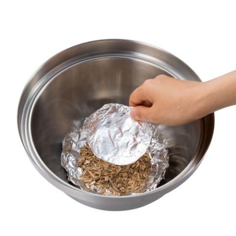 燻製中に、食品の水分や油などがチップに落ちないように、アルミホイルで小さな受け皿を作りチップの上に載せます。