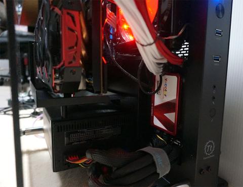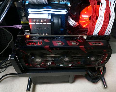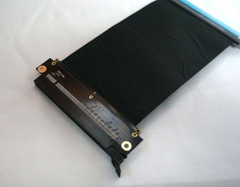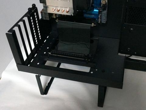 垂直配置の場合付属のライザーケーブルと専用フレームを使う。ライザーケーブルの固定部は思っていたよりしっかりしている上に、フレームも電源ユニット部と接続することで剛性を確保するカタチになっている。なるほど電源ユニットは本体が硬いので土台としてはピッタリだ。