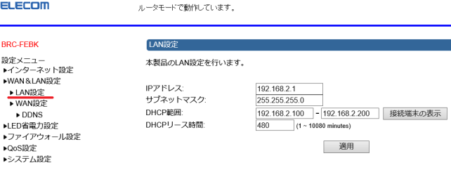 LANの設定でDHCP範囲の設定が確認出来ます、PC側で個別に設定する場合に必要です あs。