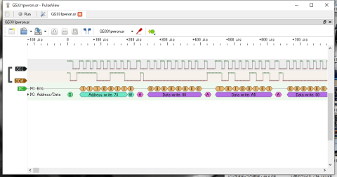 PulseViewの画面は↓の感じです。8chあるうちの、1chと2chをI2CのSCL,SDAに割り当てて、I2Cの解析機能を使用しています(画面下のI2C表示部分)。