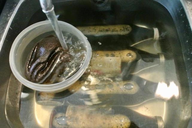 流水で洗いますので、ガラス瓶を冷やすシンク内でその作業を行い 水を無駄にしないようにしてます。