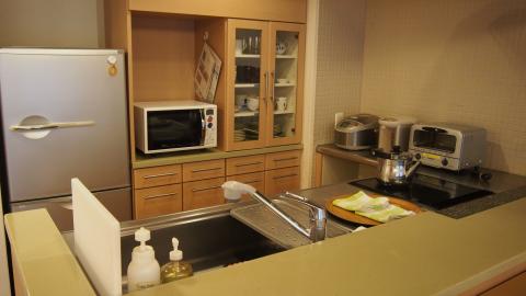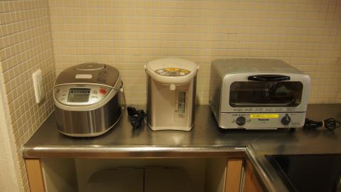 調理器具も一式そろっています。炊飯器、電気ポット、トースター、コンロは電気タイプで2口です。エスプレッソマシンもあり、フロントでカプセルを購入できるようになってました。
