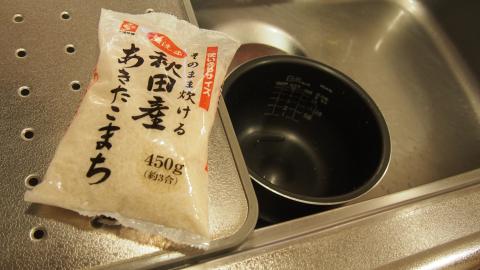 持参したお米を炊飯器で炊きます。3合の小さいお米袋を持ってきました。
