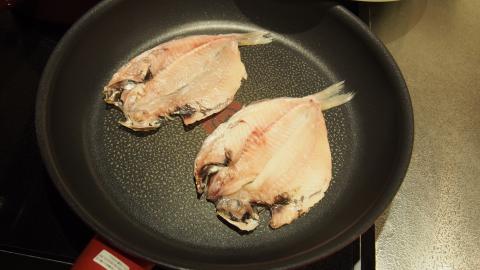 箱根湯本の干物屋さんで買ってきた干物をフライパンでジュージュー。