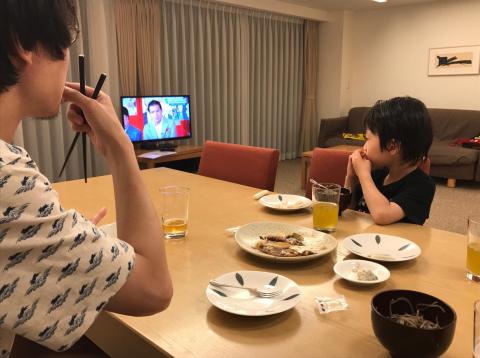 テレビ見ながら食卓に着く(お行儀悪い)日常の光景…。笑