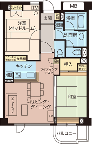 2LDKのマンションとほぼ同じといえば、広さが理解しやすいかと思います。