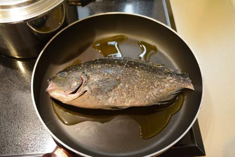 ニンニクの良い香りがしてきたら、魚に塩・胡椒を振り、フライパンで焼きます。