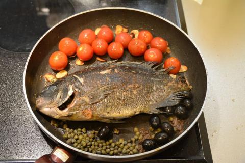 煮込む間は、フライパンを揺すって焦げ付かないようにして、ときどきお玉でスープを魚にかけると、味が染みこんで美味です。